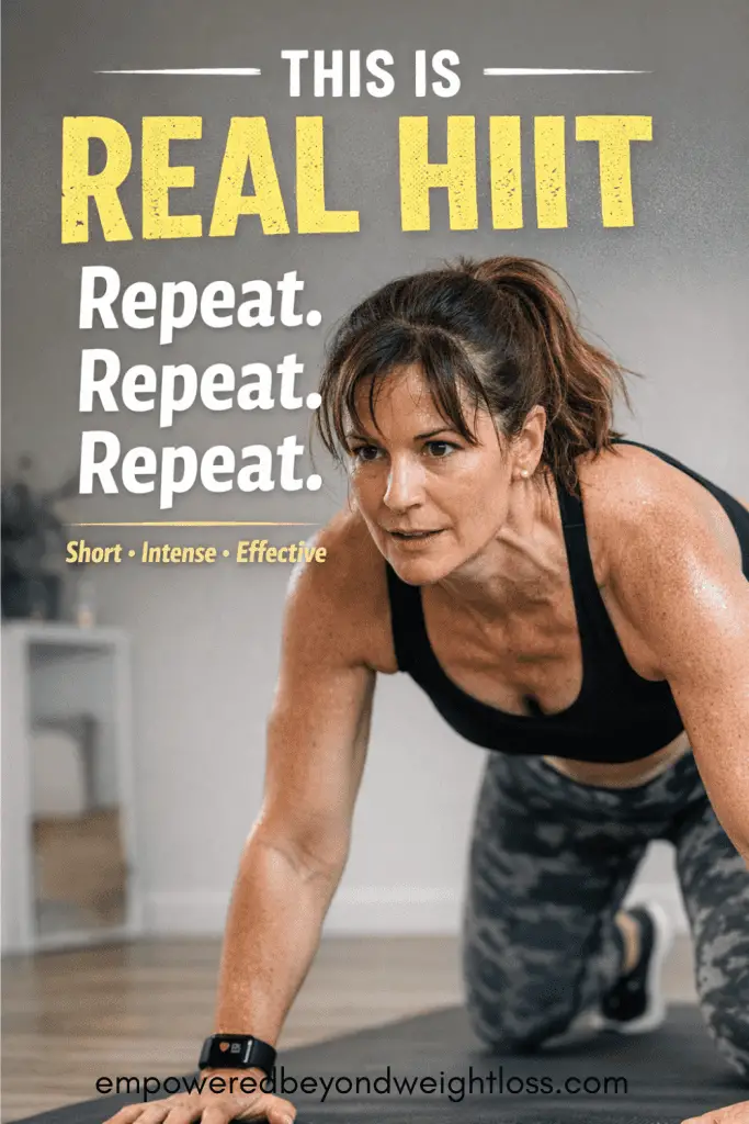 In this workout, we repeat the same movement over and over — on purpose. Why? Because true HIIT isn’t about variety. It’s about intensity. Short, uncomfortable bursts that push your heart rate into the vigorous zone, followed by real recovery.